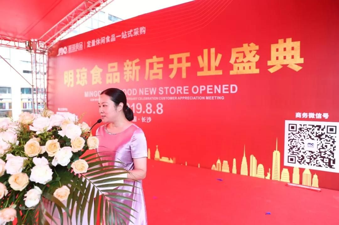 在开业仪式上,湖南高桥大市场副总经理刘亚娟受董事长罗映红先生和董事总经理罗晓女士委托,代表市场向现场嘉宾朋友和厂商表示热烈欢迎,并对明琼食品隆重开业表示热烈祝贺。她表示,明琼食品的全新开业,是其转型升级的全新成果。明琼食品紧紧把握时代发展趋势,率先在市场商户中进行品牌化建设,以客户为导向,以完美主义服务理念,赢得KA卖场、KB类连锁超市等客户的一致认可。通过两代人的努力,已经从一家批发小店,发展成为湖南经营规模大、产品品类全、服务品质优的定量装休闲食品一站式采购基地。
